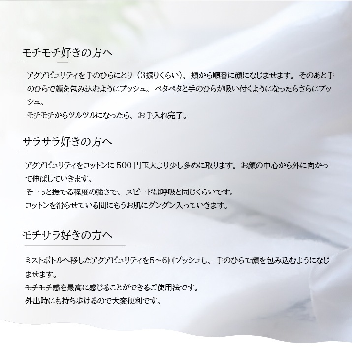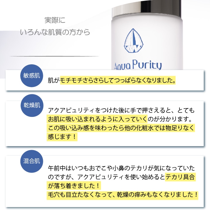 など、お肌のトラブルで真剣にお悩みで、どんな粧水やスキンケア商品を使用しても合わなかった方はぜひ一度このサンプルを使ってアクアピュリティの実力を体感してみてください。