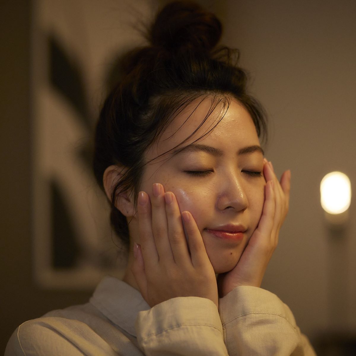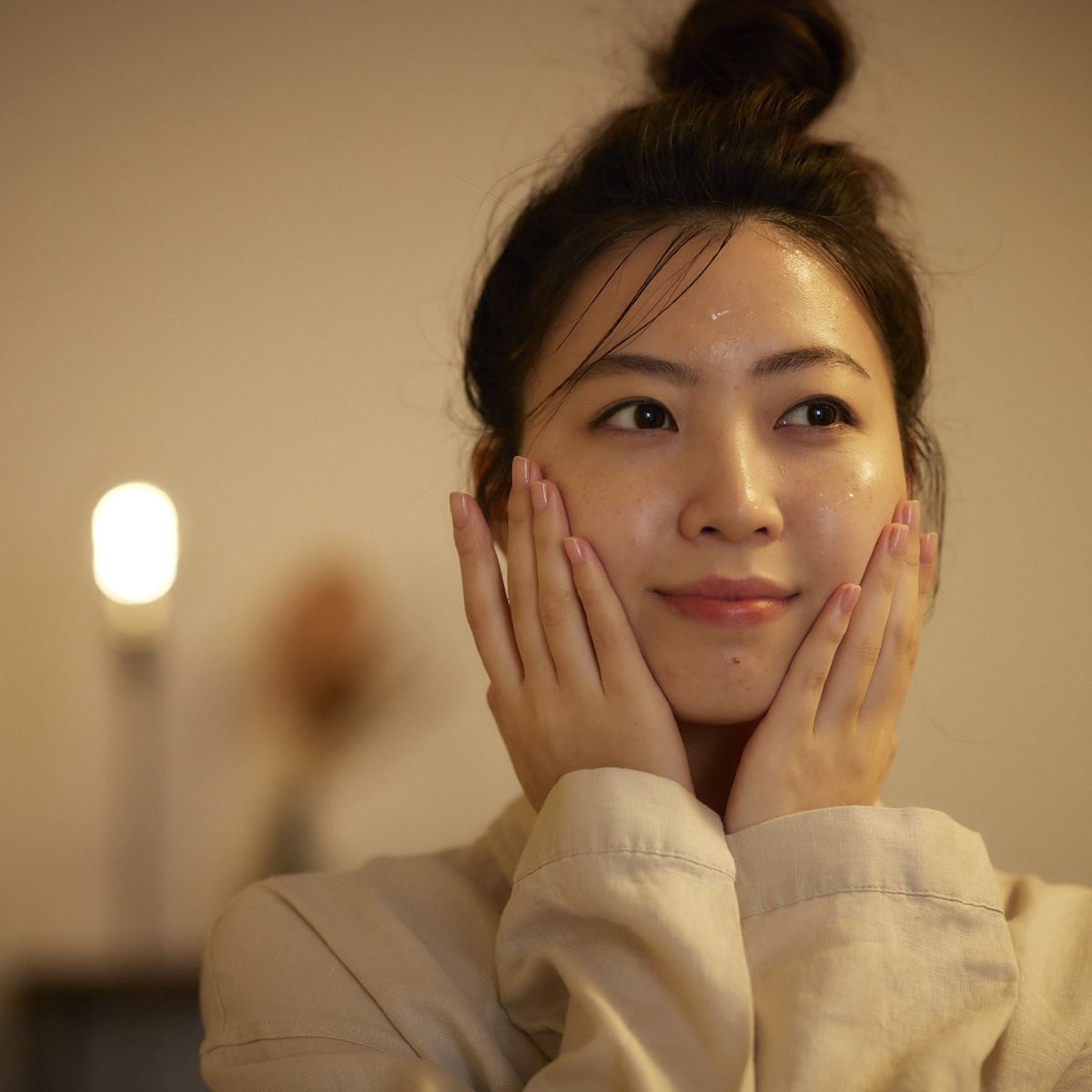 顔の中心から外側に向かって、指全体でやさしく引き上げるようにのばします。のばした後は顔全体を手のひらで数秒間プレスしてなじませます。