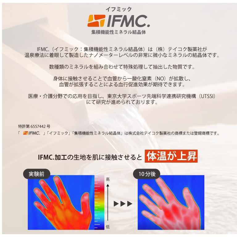 IFMC.(イフミック:集積機能性ミネラル結晶体)は(株)テイコク製薬社が温泉療法に着眼して製造したナノメーターレベルの非常に微小なミネラルの結晶体です。数種類のミネラルを組み合わせて特殊処理して抽出した物質です。
